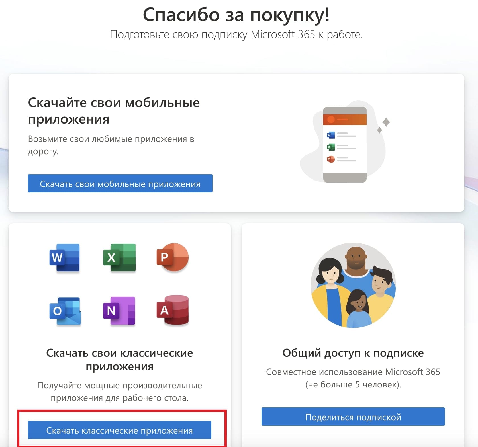 4) Теперь Ваша подписка активна. Вы автоматически перенаправитесь в личный кабинет Microsoft 365, где сможете делиться подпиской на другие учетные записи (устройства), в случае если у Вас подписка “Для семьи” и так же можете скачать приложение.