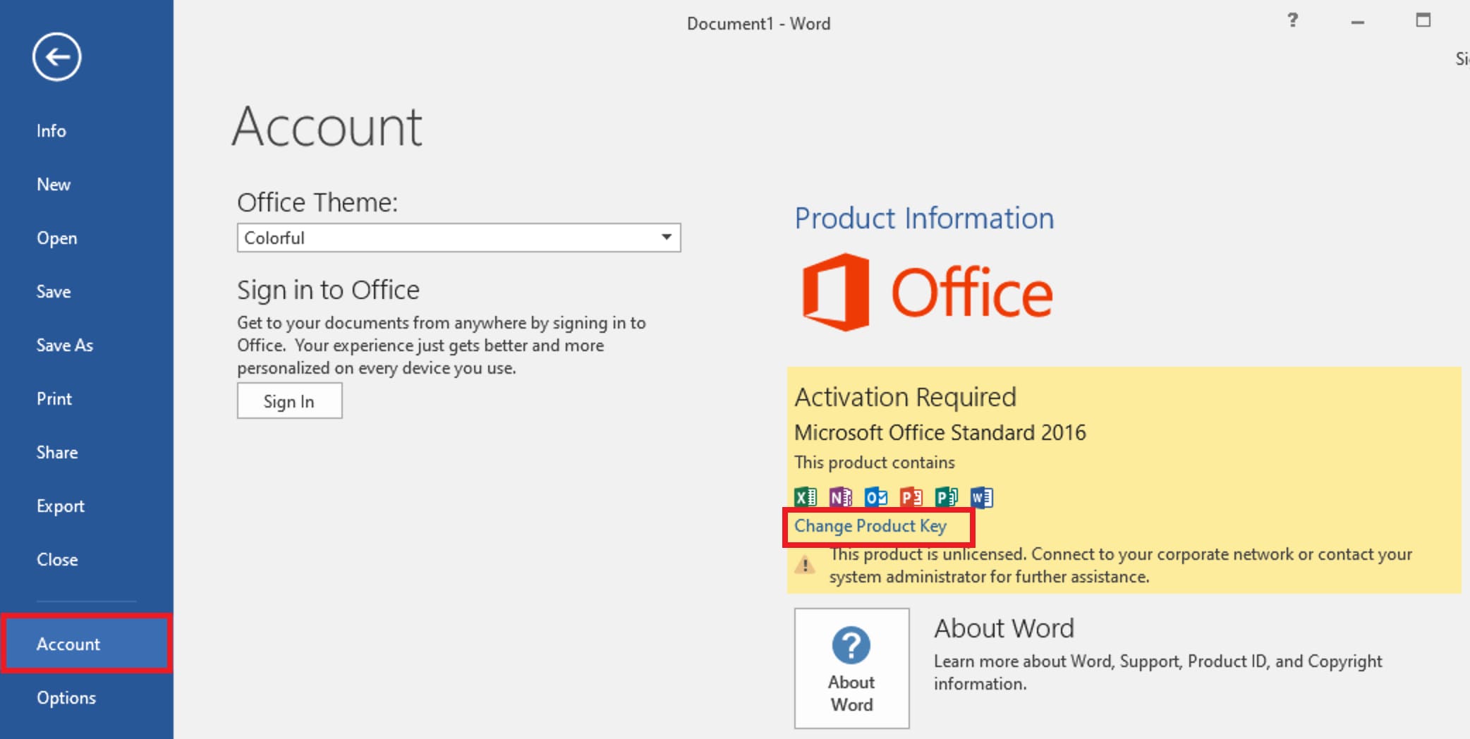 Now we launch any Office application, for example Exel => File menu => Account. There we click on “Change product key”.