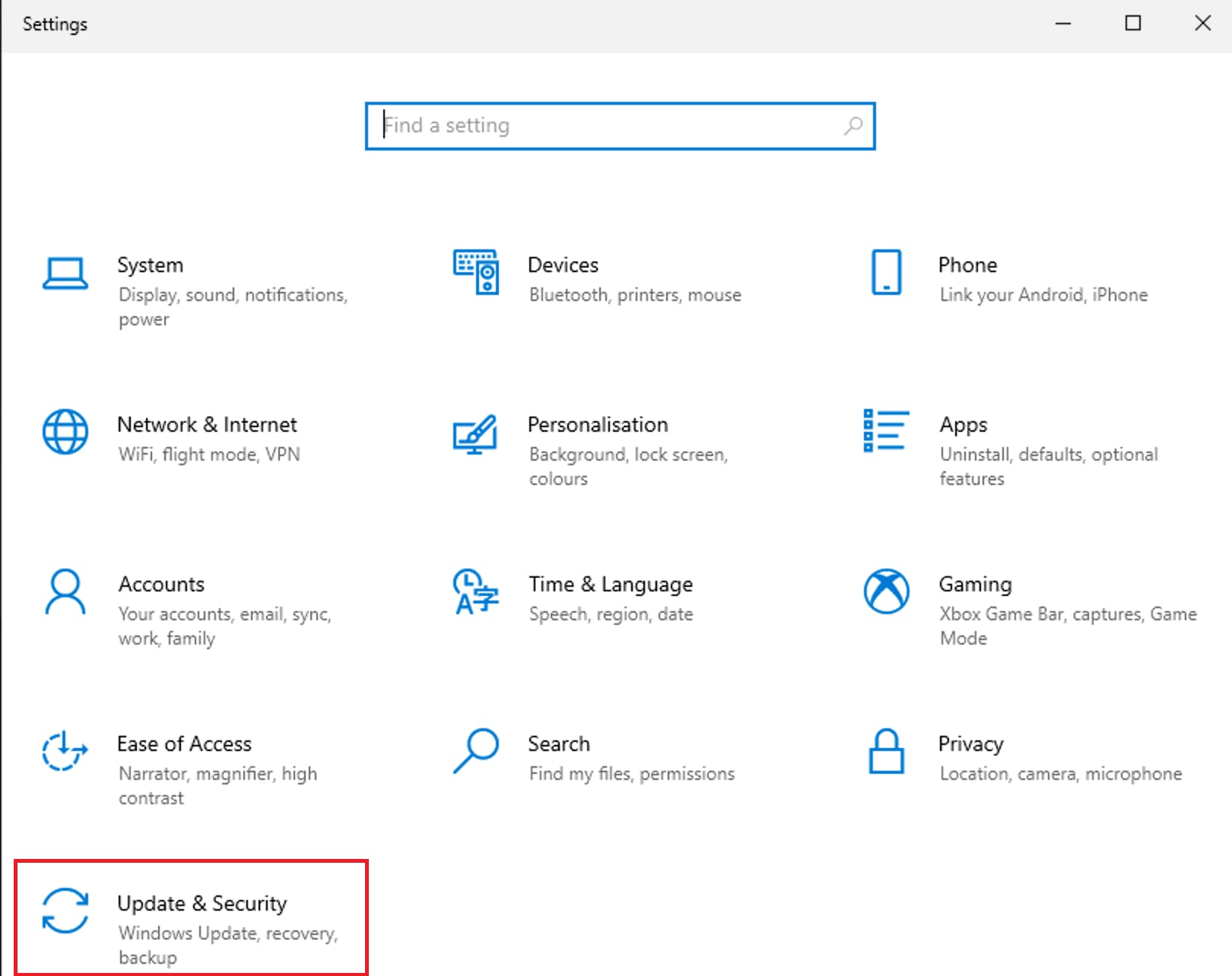 3) Next, open the “Update and Security” menu.