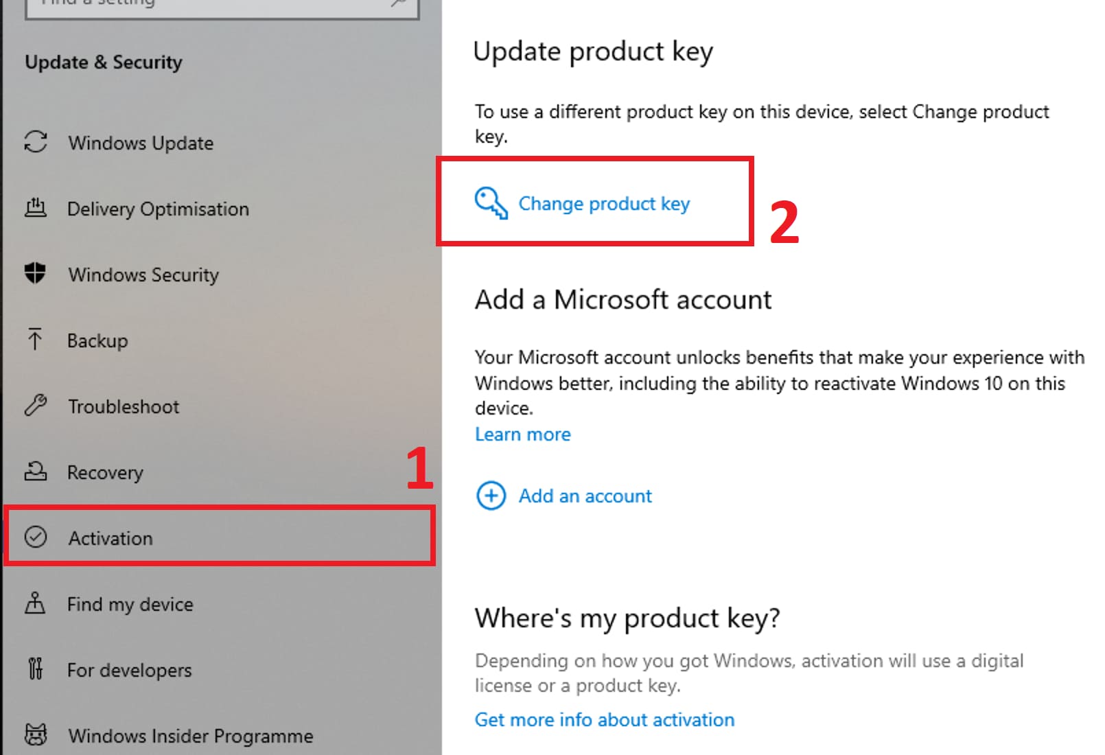 4) Next, in the “Activation” menu, click on “Change product key”.