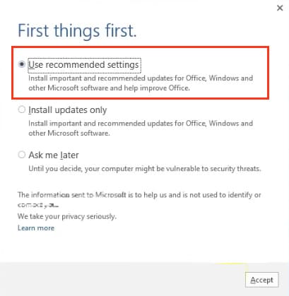 When Excel opens, you will see a window prompting you to apply update settings. You can choose “Recommended” so the application will download and install updates automatically. Apply the settings.