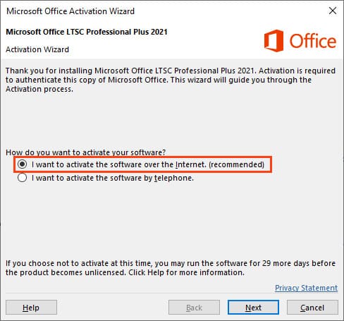 11) In the Microsoft Office Activation Wizard, select “Activate this software over the Internet,” and click “Next.”