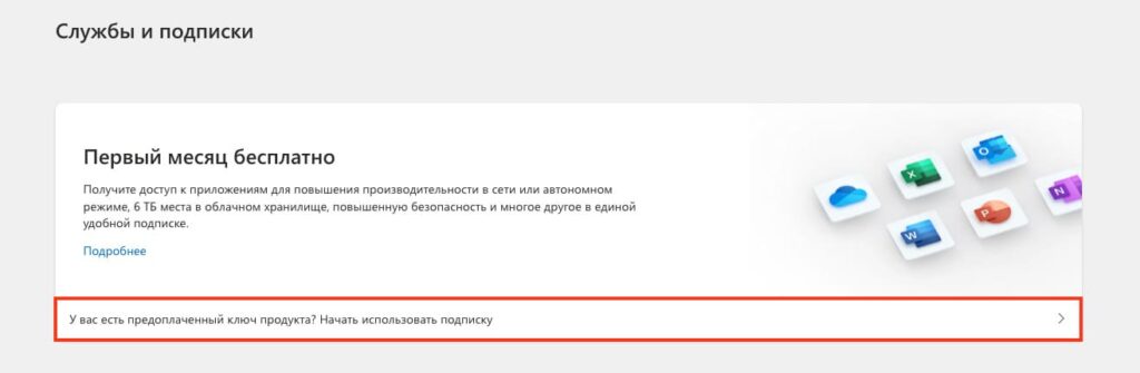3) После входа в аккаунт в разделе “Службы и подписки” выберите пункт «У вас есть предоплаченный ключ продукта? Начать использовать подписку».