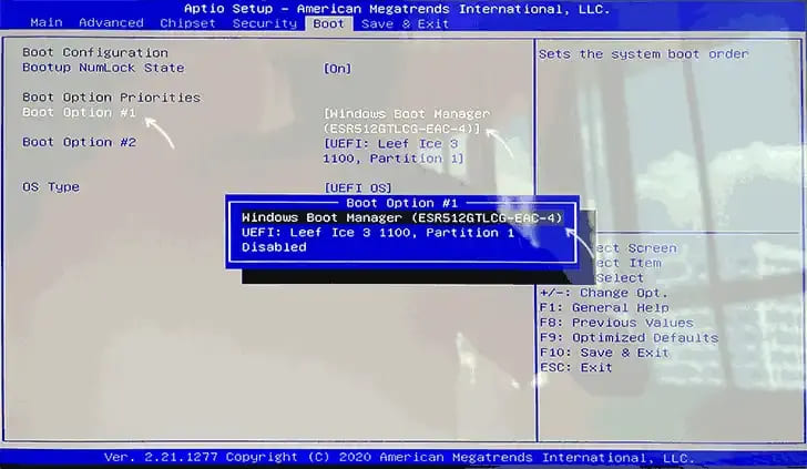 1. В БИОС/UEFI убедитесь, что первым устройством загрузки (Boot Option 1) выставлено нужное устройство.