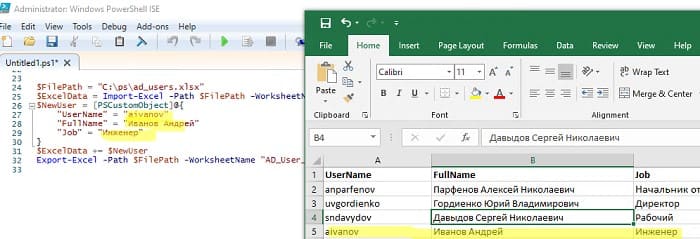 $ExcelWorkSheet = $ExcelWorkBook.Sheets.Item("AD_User_List")# Получаем количество заполненных строк в XLSX файле