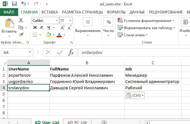 Этот скрипт получает данные о пользователях из Active Directory и добавляет их в файл Excel.
