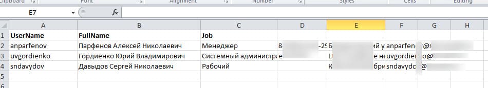 Рассмотрим практический пример использования PowerShell для получения данных из Excel. Например, вы хотите получить информацию о каждом пользователе из Active Directory, такую как телефон (атрибут telephoneNumber), отдел (department) и email (mail).