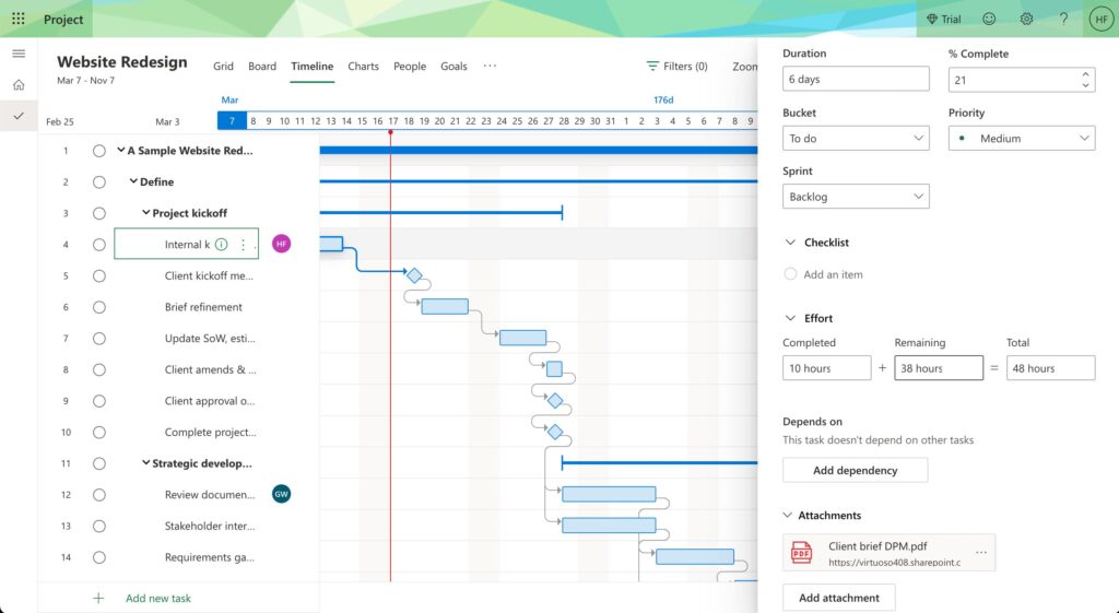 Диаграммы Ганта с расширенными возможностями: Диаграммы Ганта остаются основным способом отображения плана проекта, но в Project 2024 появились новые функции, которые позволяют пользователям настраивать и фильтровать задачи для лучшего анализа.