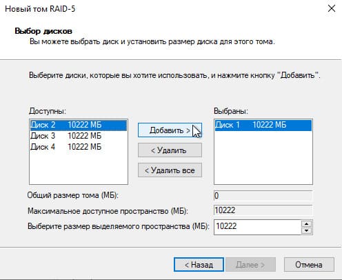 3. Выберите остальные диски, которые будут частью массива RAID 5.