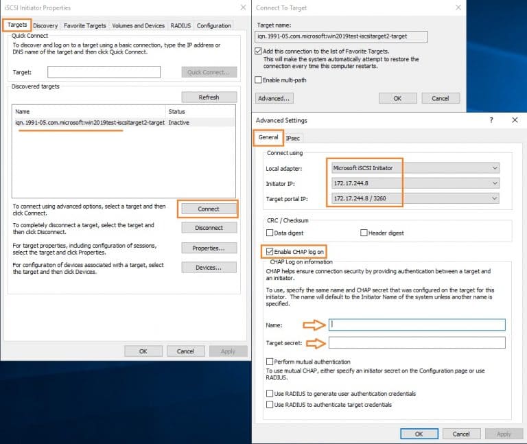 – Go to the Targets tab, where a new connection will appear. To enable it, click Connect -> Advanced, select values from the dropdowns, check Enable CHAP log on, and enter the username and a 12-character password.