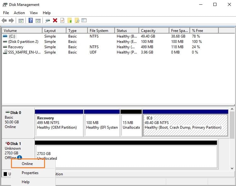 – After connecting, the disk will be in an Offline state. Open the Disk Management console, select the new disk, set it to Online, and then perform Initialize Disk.