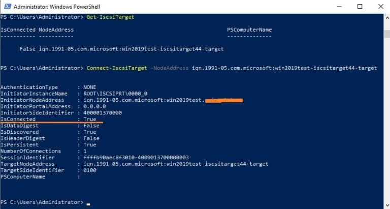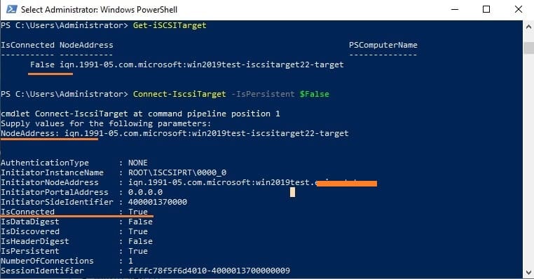 Connect-IscsiTarget -NodeAddress iqn.1991-05.com.microsoft:win2019test-iscsitarget33-target