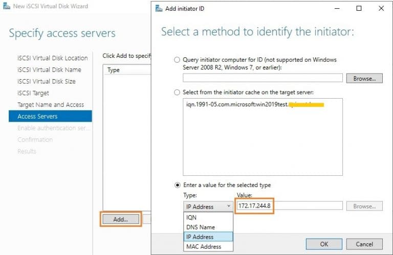 – At the initiator selection stage (servers connecting to the target), choose an identification method: IP Address, IQN, DNS Name, or MAC Address. We’ll use the IP Address option.