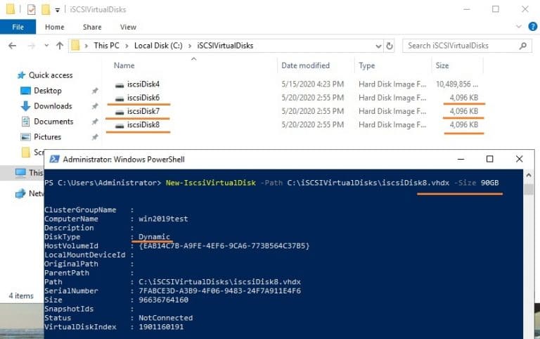 New-IscsiVirtualDisk -Path C:\iSCSIVirtualDisks\iscsiDisk2.vhdx -Size 200GB -UseFixed