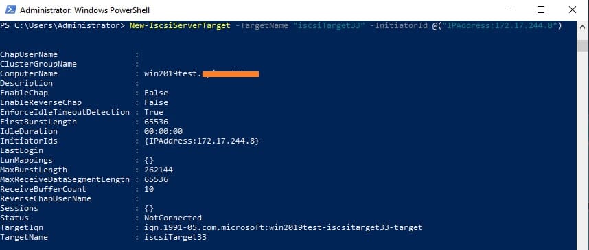 New-IscsiServerTarget -TargetName iscsiTarget33 -InitiatorIds "IQN: 1991-05.com.microsoft:win2019test.ddd.com"
