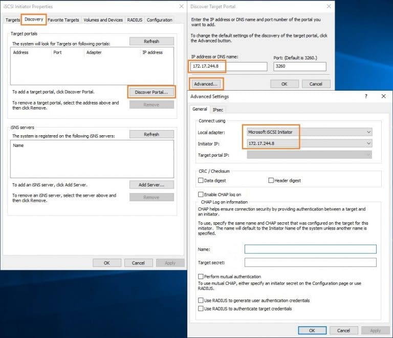 – Go to the Discovery tab, click Discover Portal, and enter the iSCSI target IP address.