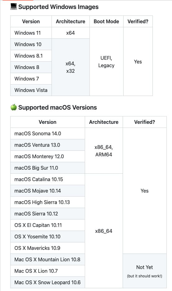 In the screenshot below, the versions of Windows that you can write to the USB drive using WinDiskWriter, as well as the Mac OS versions it works on, are listed.