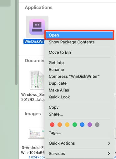 1) Open WinDiskWriter by right-clicking on it and click “Open” in the pop-up window.
