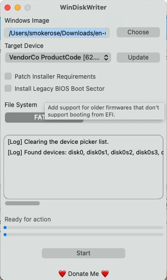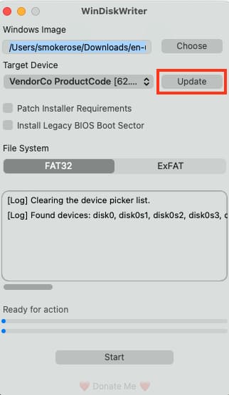 3) After this, insert the USB drive into your Mac and in the WinDiskWriter program click “Update” to display it as the destination device.