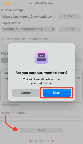 5) Now click “Start”, note that all data on the USB drive will be erased, so make sure to transfer any necessary files to another disk or USB drive beforehand.