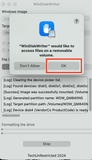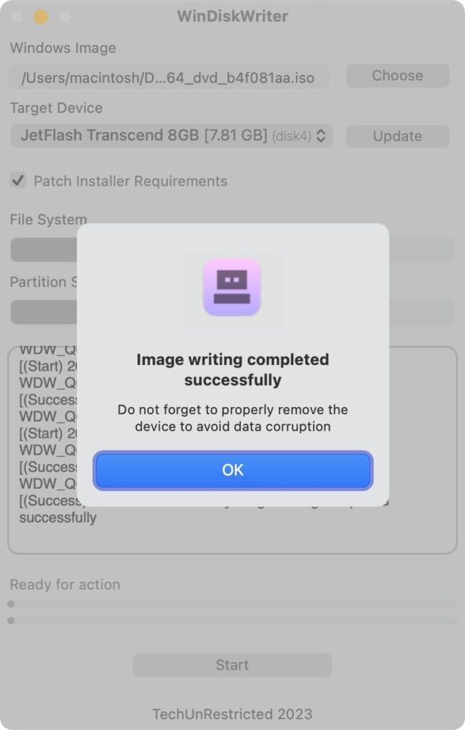 6) In the pop-up window, click “OK”. And just wait for Windows to be written.
