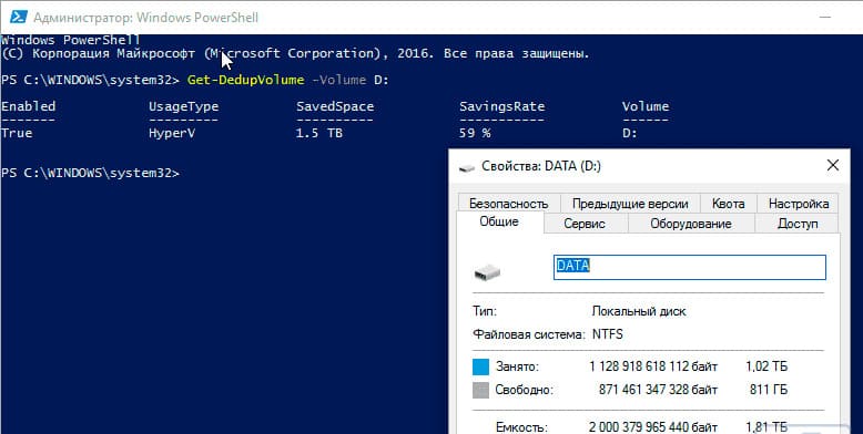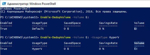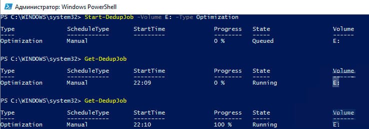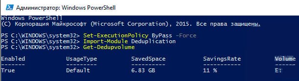 После успешной установки пакетов доступ к уже дедуплицированным данным восстановится без перезагрузки. Графических инструментов для управления дедупликация в Windows 10 нет, поэтому используем PowerShell.