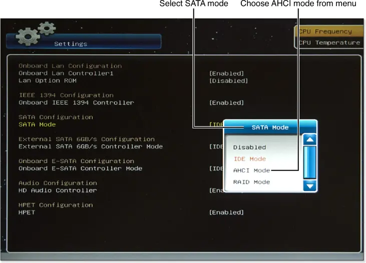 1. If AHCI causes boot errors, revert to IDE ATA mode in BIOS.
