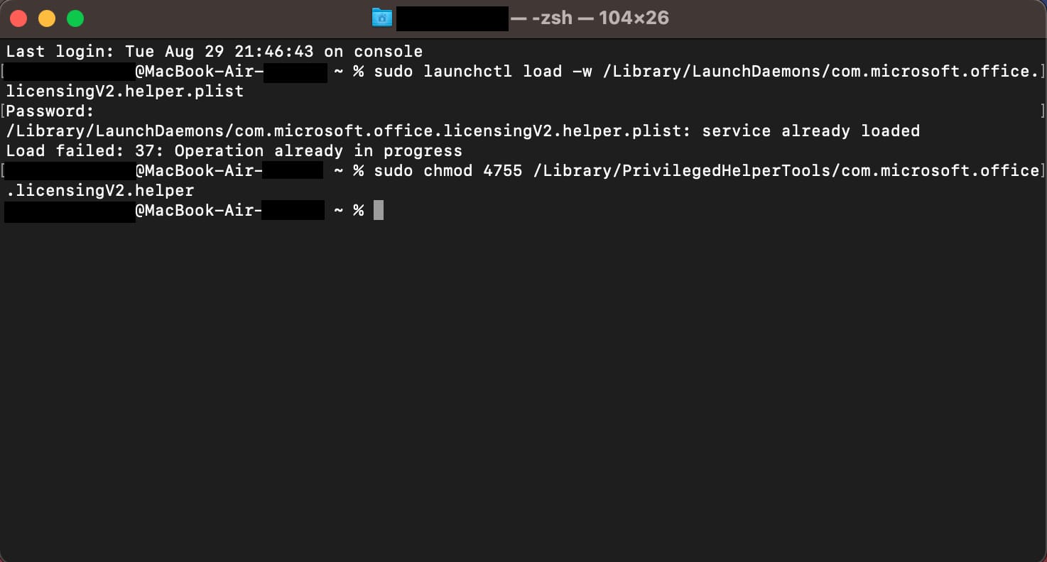 sudo chmod 4755 /Library/PrivilegedHelperTools/com.microsoft.office.licensingV2.helper