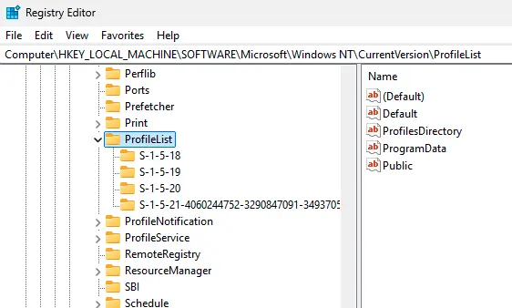 HKEY_LOCAL_MACHINE\SOFTWARE\Microsoft\Windows NT\CurrentVersion\ProfileList