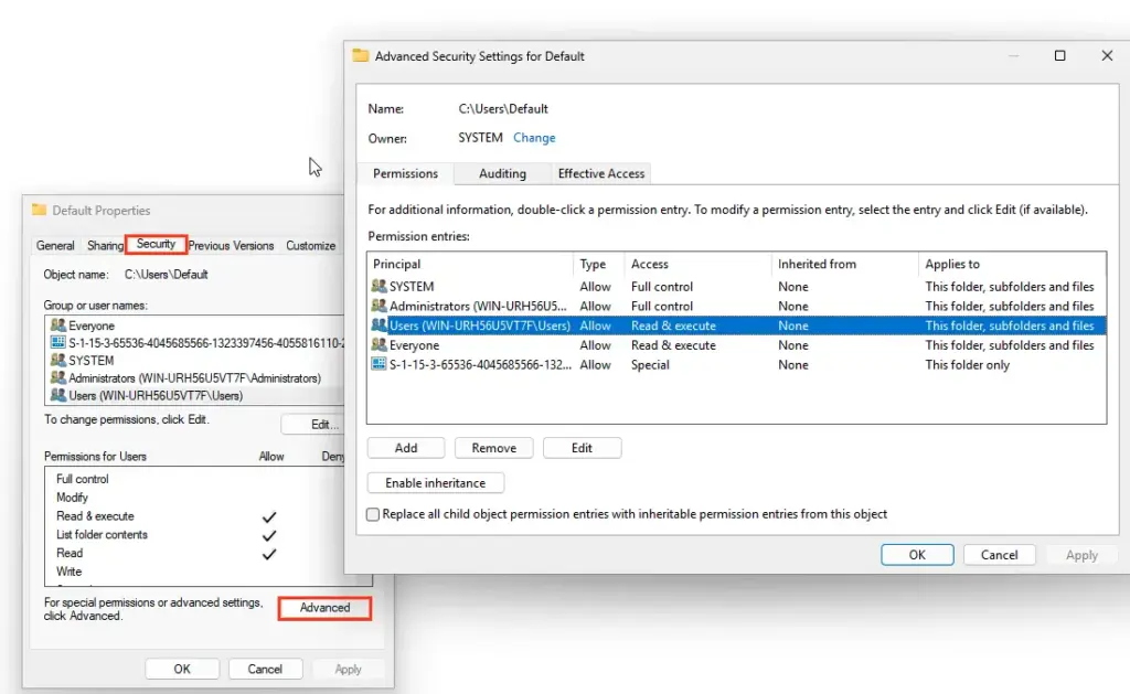 1. Grant the Users group read permissions on the C:\Users\Default directory.