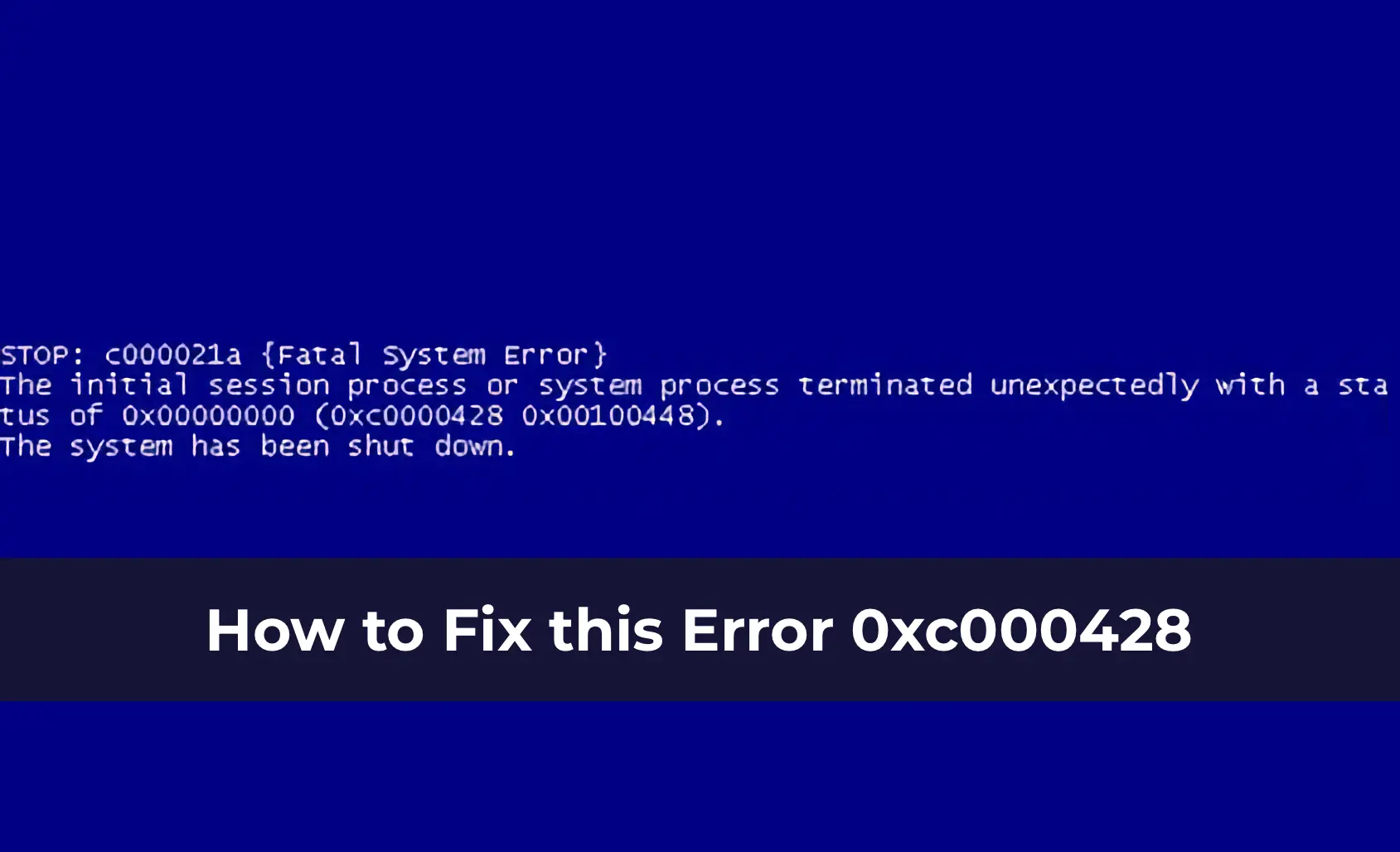 The error 0xc000428 indicates that Windows cannot verify the digital signature of a driver.