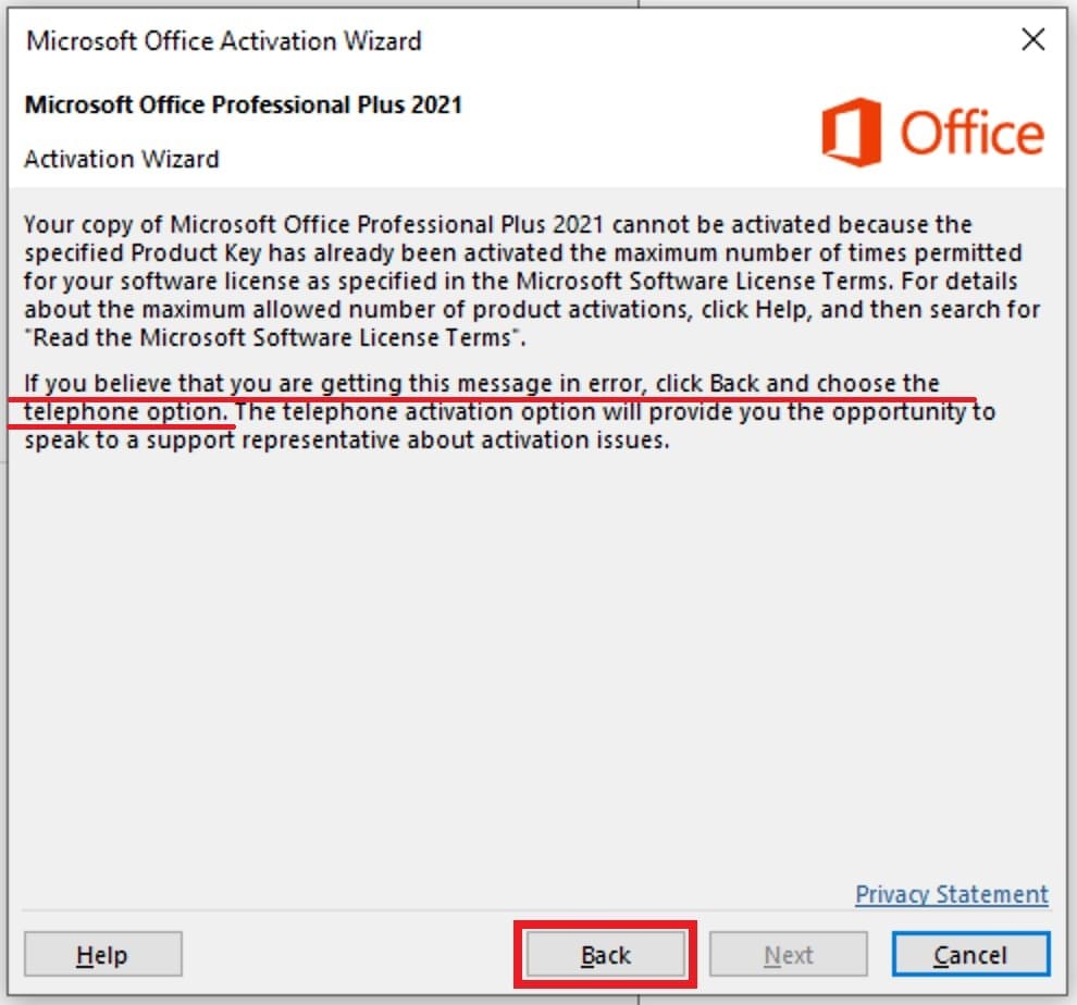 In this article, we will consider a situation when, when activating Microsoft Office 2021 online, an activation error appears as in the screenshot below, in this case, according to the advice from the second paragraph from the description of this error, you need to activate the application by phone. Activation is carried out using a robot answering machine, you will need to type numbers on the keyboard of your phone. After seeing this error, click “Back” and select the activation item by phone.