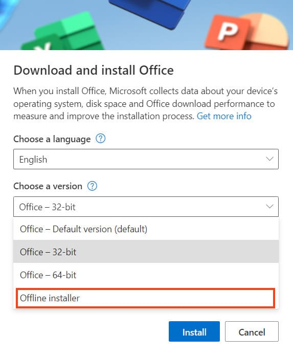 5) For proper installation, it is recommended that you select the ‘Offline installer’ from the drop-down menu. Then click “Install”.