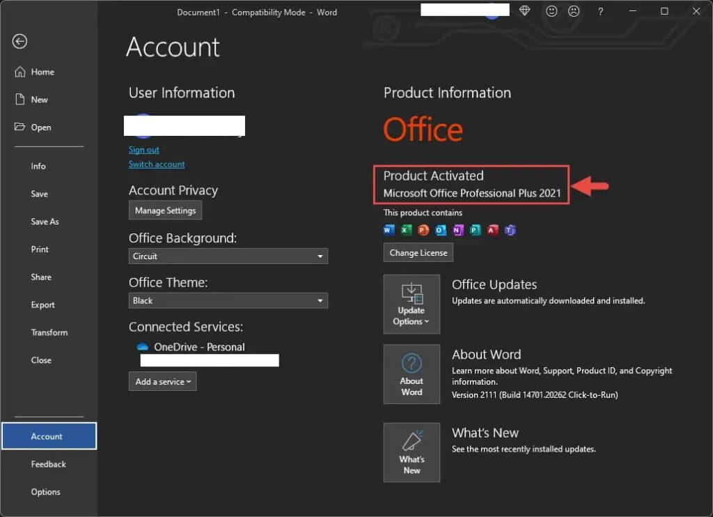 – Now you can check if your license is activated. You can check this from any Office application, e.g. Word => File => Account menu.