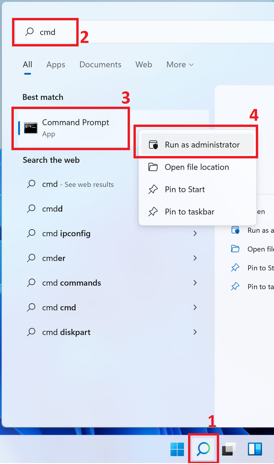 2) Now let’s proceed to the activation of Windows 11 by phone. Click on the Start menu => Enter in the search bar CMD => Then right-click on the result “Command Prompt” => Run as administrator .