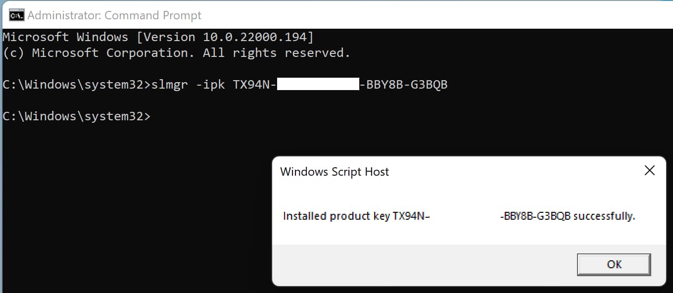 3) Next, in the command promt itself (terminal), enter the command slmgr -ipk XXXXX-XXXXX-XXXXX-XXXXX-XXXXX (where “X” is the key itself). Then press Enter.