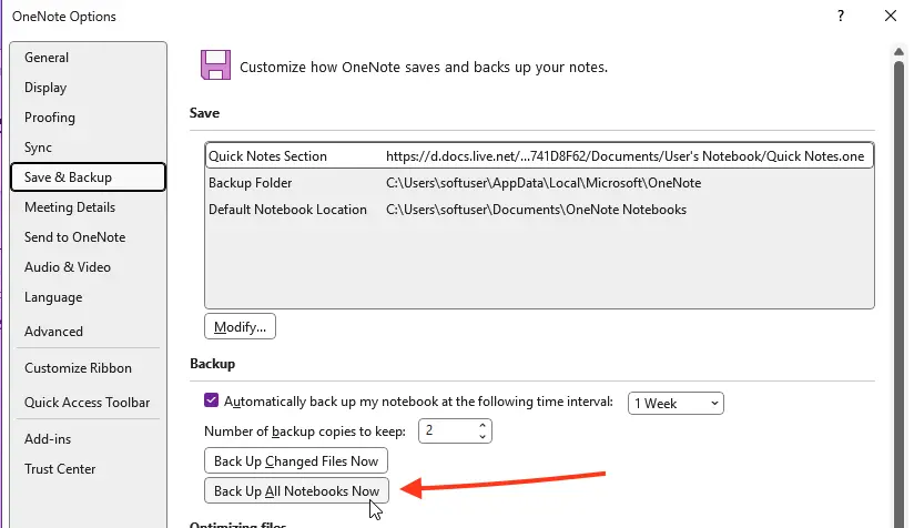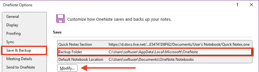 2. In the OneNote Options dialog box, select Save & Backup.