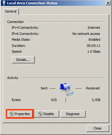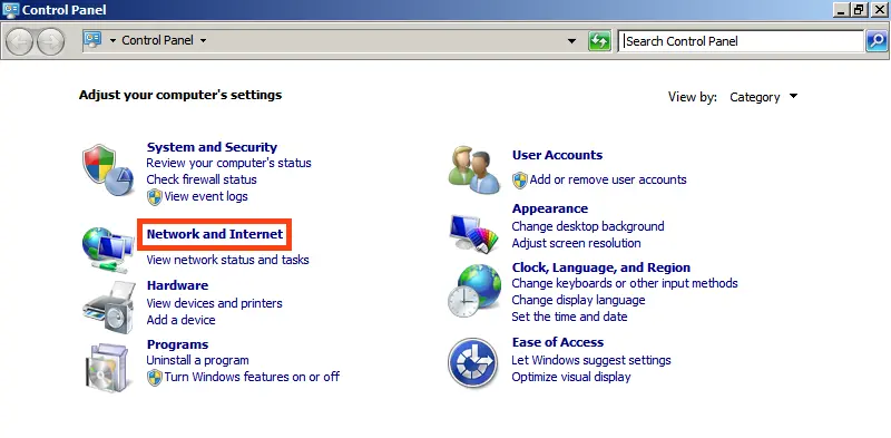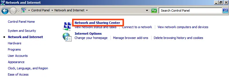 Then, go to “Control Panel” => Network and Internet => Network and Sharing Center => Local Area Connection.