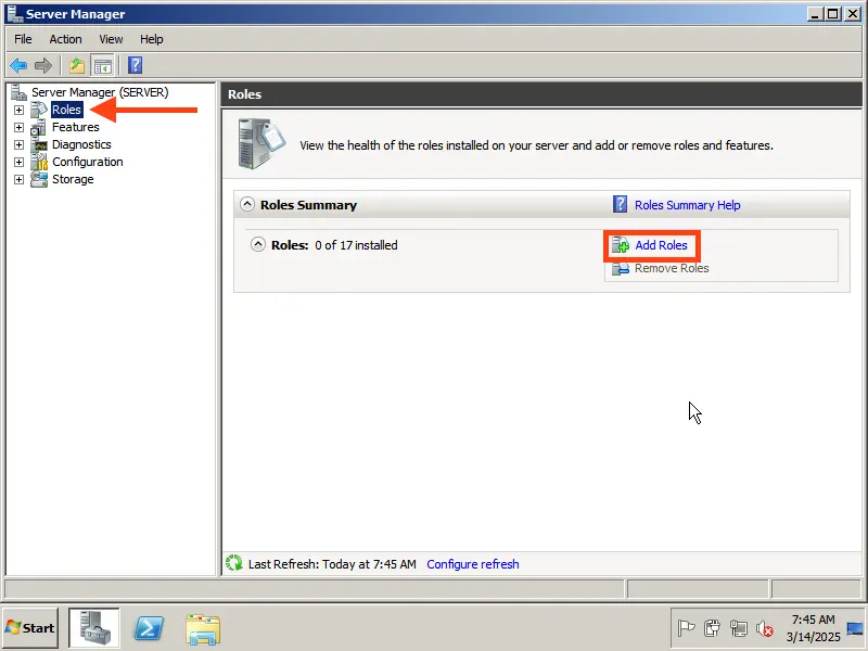 3) Now, let’s proceed to installing roles. Go to Server Manager, click on “Roles” => Add Roles.