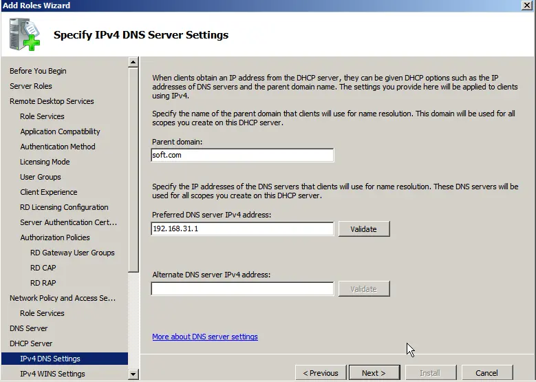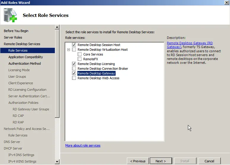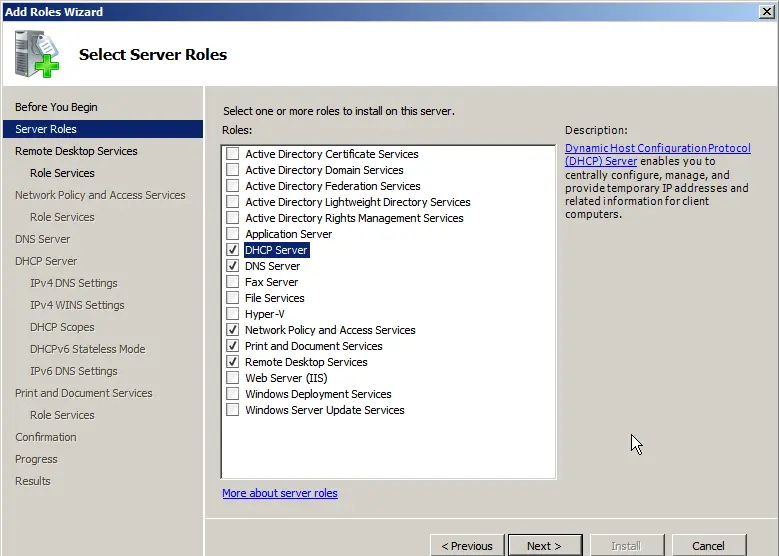 Here, select the roles you need for your server. Most role settings are configured during the role installation. We will demonstrate by installing a DHCP server, assigning an IP address range for distribution on the local network, setting up a domain, and configuring Remote Desktop Services.