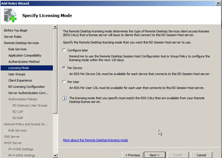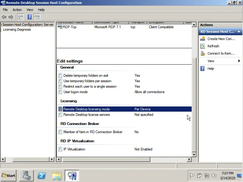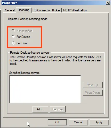 At the bottom, select “Licensing” => “Remote Desktop Licensing Mode.”