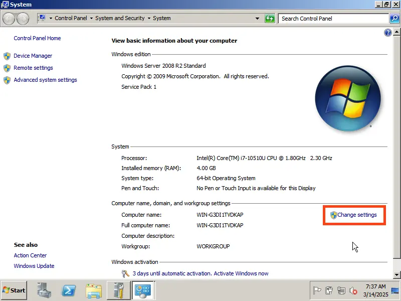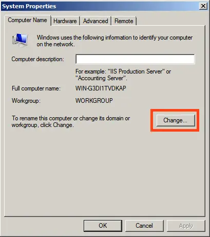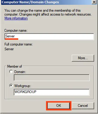 1) First, we need to change the server name to something more convenient for identification. Go to “Computer Properties” => Change settings => In the “System Properties” window, click “Change.” Then, enter your desired server name in the “Computer name” field and click “OK.” Your computer will need to restart to apply the changes.