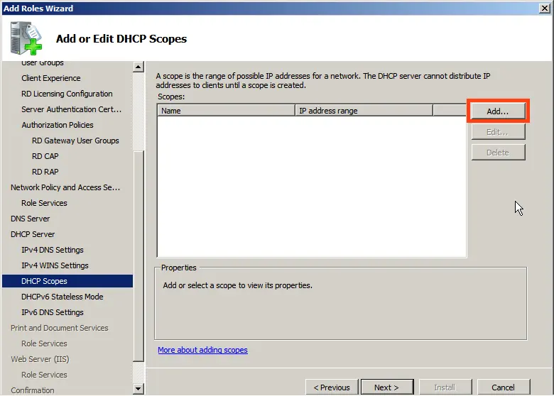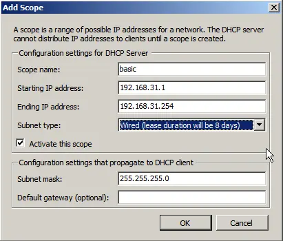 Assign a name to your DHCP server, the starting IP address, and the ending IP address that your server will distribute.