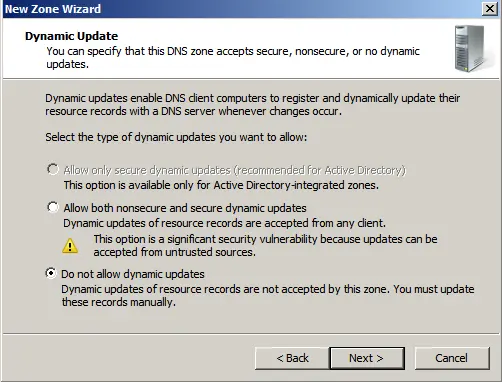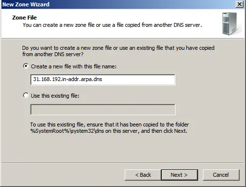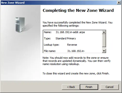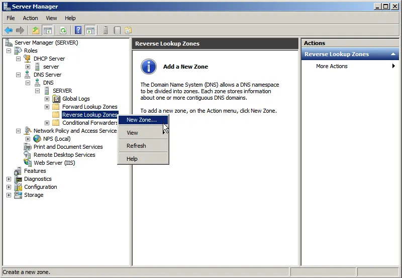 4) Now, let’s configure DNS (domain). Open the “Server Manager” tree => DNS Server => DNS => Your server name (in our case, “Server”) => Global Logs => Reverse Lookup Zones => Create New Zone.