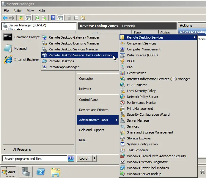 Go to “Start” => Administrative Tools => Remote Desktop Services => Remote Desktop Session Host Configuration.