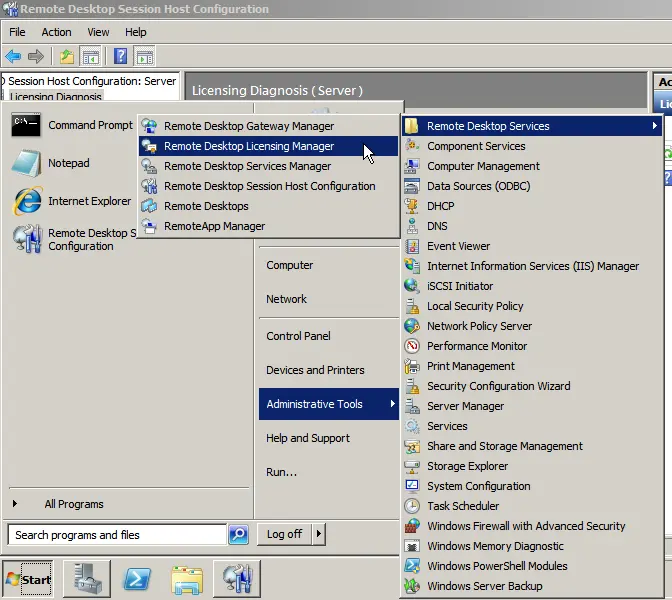 Go to “Start” => Administrative Tools => Remote Desktop Services => Remote Desktop Licensing Manager.
