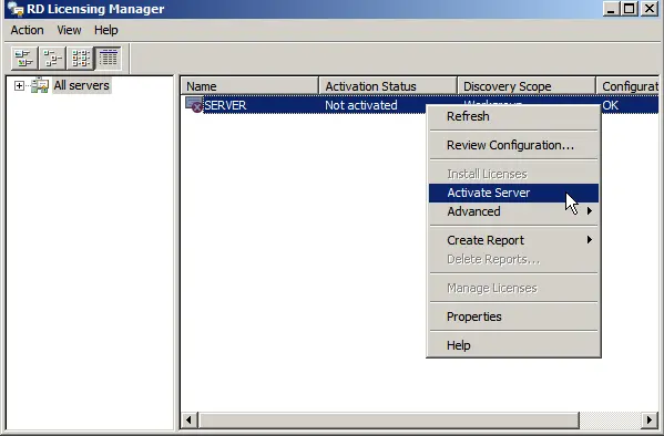 In the new window, you will see your server with the activation status “Not Activated.” Right-click => Activate Server.