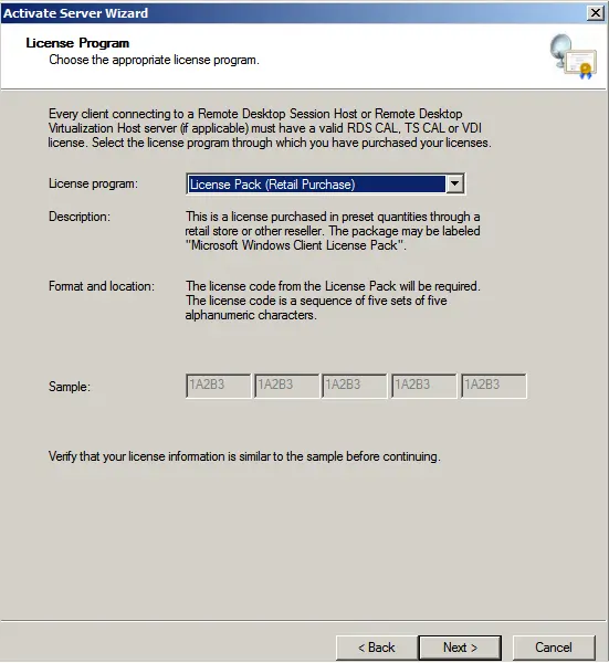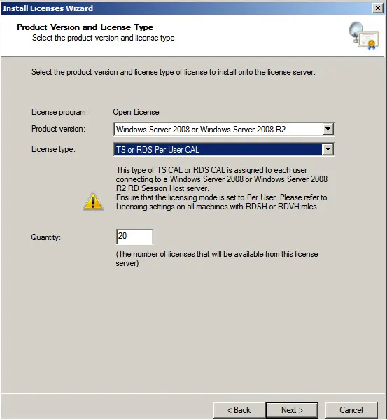 Now, choose your licensing type based on your product key: RDS User or Device CAL. If you do not have a product key, you can purchase one in our catalog. The settings for “per user” or “per device” are identical, differing only in the licensing type and your product key.