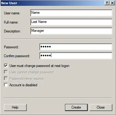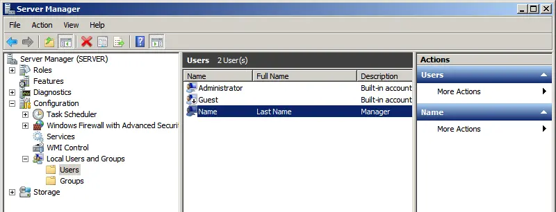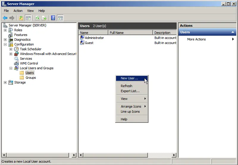 6) However, to connect via RDP, we need users, or more precisely, we need to create them. Go to “Server Manager” => Open the “Configuration” tree => Local Users and Groups => Select “Users,” then right-click in the users window => New User.