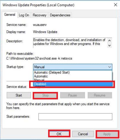 — In the “Startup type” section, select “Disabled”, then click “Stop”, followed by “Apply” => “OK”.